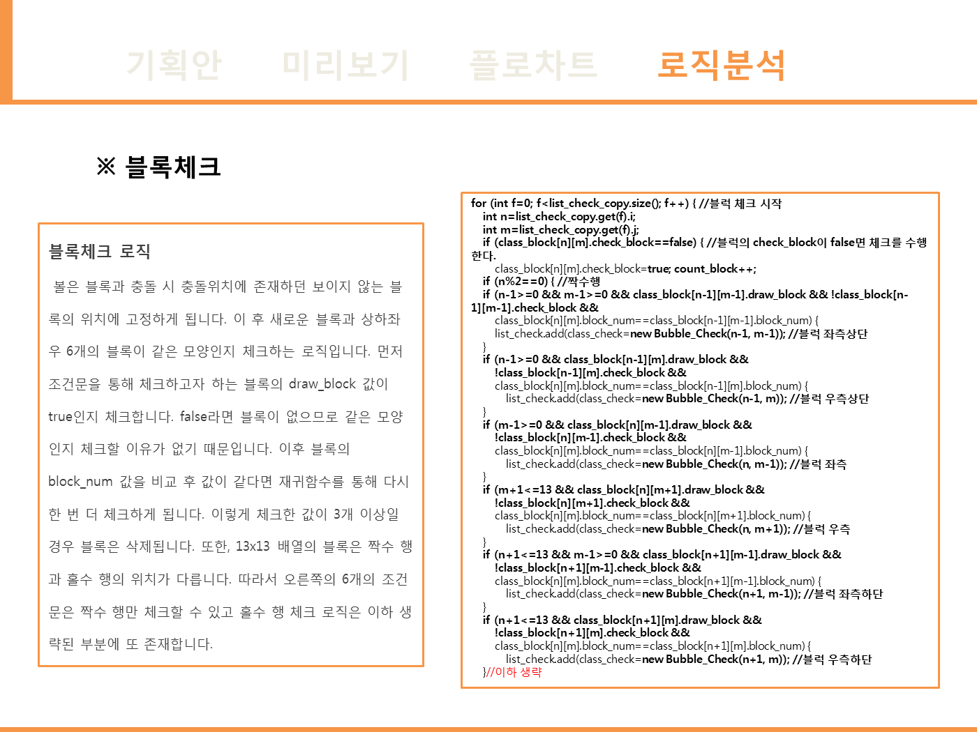 - 구슬 3개 이상 인접했는지 체크 로직 : 재귀함수를 통해 인접한 구슬이 같은 모양인지 체크합니다.